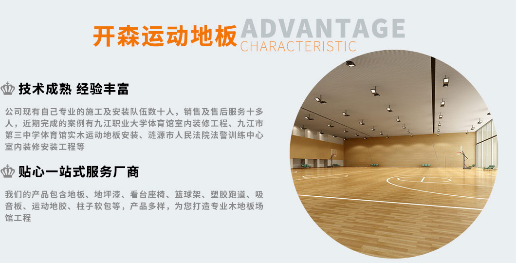 九江開(kāi)森地板有限公司是集運(yùn)動(dòng)木地板生產(chǎn)、安裝與銷售一體的廠家,專業(yè)化的技術(shù)隊(duì)伍,國(guó)際先進(jìn)的施工設(shè)備,我們的管理層擁有多年體育場(chǎng)館建造經(jīng)驗(yàn),在業(yè)界獲得良好聲譽(yù)及甲方的好評(píng)。